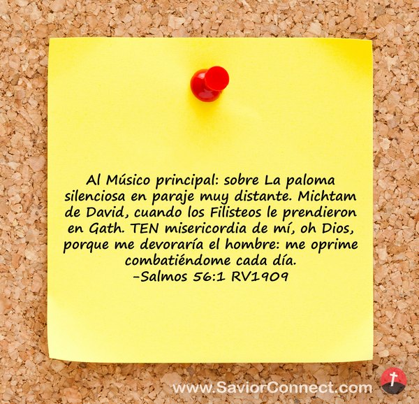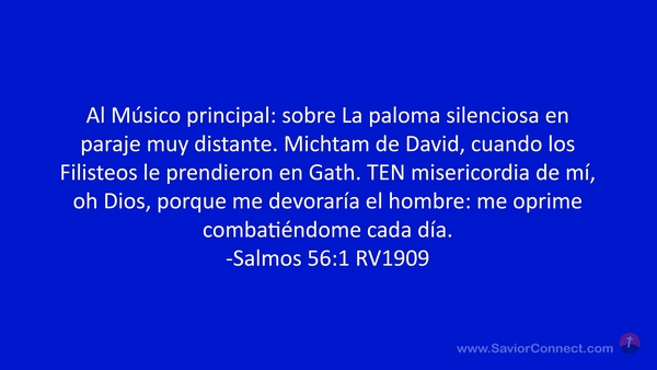 Al Músico principal: sobre La paloma silenciosa en paraje muy distante. Michtam de David, cuando los Filisteos le prendieron en Gath. TEN misericordia de mí, oh Dios, porque me devoraría el hombre: me oprime combatiéndome cada día. -Salmos 56:1 RV1909