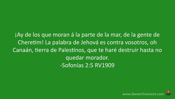 ¡Ay de los que moran á la parte de la mar, de la gente de Cheretim! La palabra de Jehová es contra vosotros, oh Canaán, tierra de Palestinos, que te haré destruir hasta no quedar morador. -Sofonías 2:5 RV1909