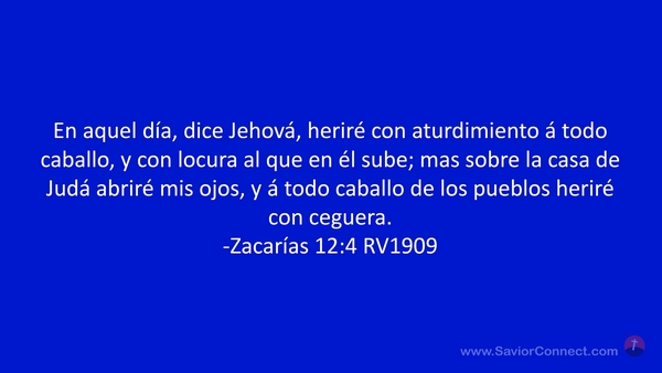 En aquel día, dice Jehová, heriré con aturdimiento á todo caballo, y con locura al que en él sube; mas sobre la casa de Judá abriré mis ojos, y á todo caballo de los pueblos heriré con ceguera. -Zacarías 12:4 RV1909