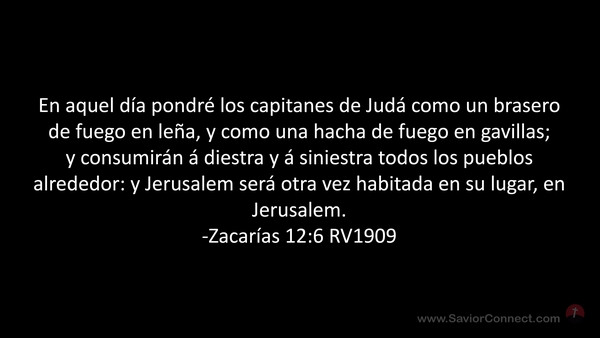 En aquel día pondré los capitanes de Judá como un brasero de fuego en leña, y como una hacha de fuego en gavillas; y consumirán á diestra y á siniestra todos los pueblos alrededor: y Jerusalem será otra vez habitada en su lugar, en Jerusalem. -Zacarías 12:6 RV1909