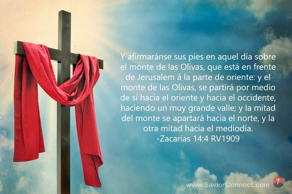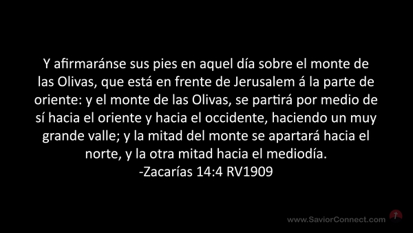 Y afirmaránse sus pies en aquel día sobre el monte de las Olivas, que está en frente de Jerusalem á la parte de oriente: y el monte de las Olivas, se partirá por medio de sí hacia el oriente y hacia el occidente, haciendo un muy grande valle; y la mitad del monte se apartará hacia el norte, y la otra mitad hacia el mediodía. -Zacarías 14:4 RV1909