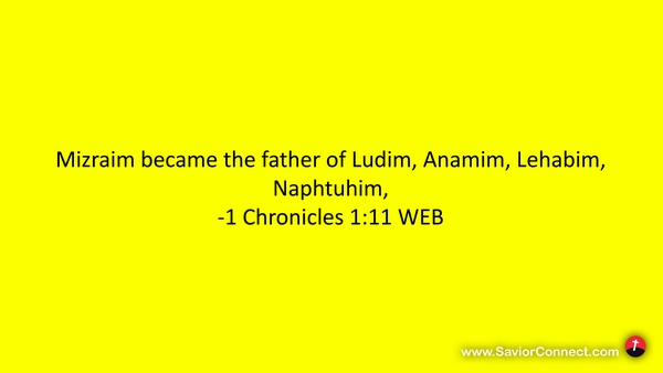 Mizraim became the father of Ludim, Anamim, Lehabim, Naphtuhim, -1 Chronicles 1:11 WEB