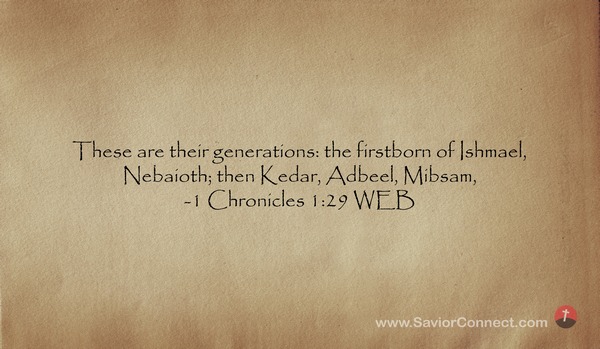 These are their generations: the firstborn of Ishmael, Nebaioth; then Kedar, Adbeel, Mibsam, -1 Chronicles 1:29 WEB