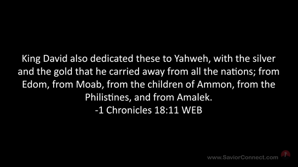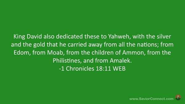 King David also dedicated these to Yahweh, with the silver and the gold that he carried away from all the nations; from Edom, from Moab, from the children of Ammon, from the Philistines, and from Amalek. -1 Chronicles 18:11 WEB