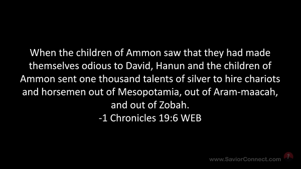 When the children of Ammon saw that they had made themselves odious to David, Hanun and the children of Ammon sent one thousand talents of silver to hire chariots and horsemen out of Mesopotamia, out of Aram-maacah, and out of Zobah. -1 Chronicles 19:6 WEB