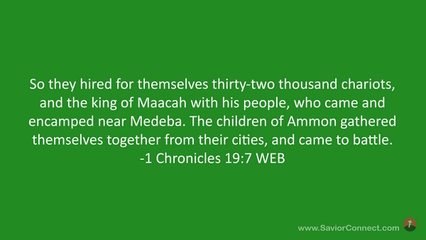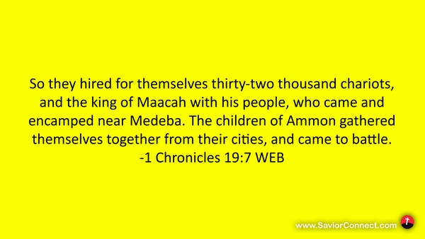 So they hired for themselves thirty-two thousand chariots, and the king of Maacah with his people, who came and encamped near Medeba. The children of Ammon gathered themselves together from their cities, and came to battle. -1 Chronicles 19:7 WEB