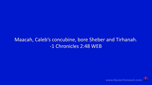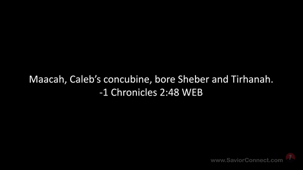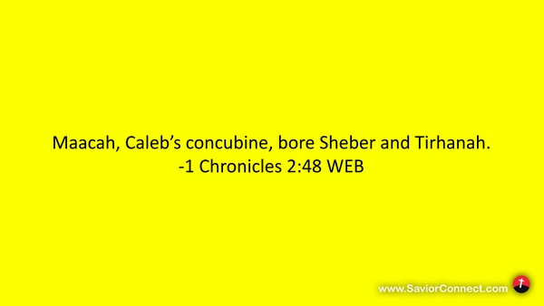 Maacah, Caleb’s concubine, bore Sheber and Tirhanah. -1 Chronicles 2:48 WEB