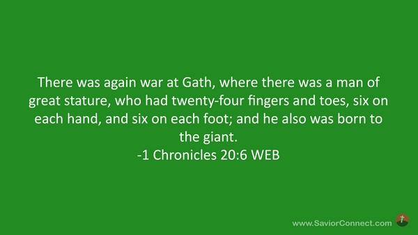 There was again war at Gath, where there was a man of great stature, who had twenty-four fingers and toes, six on each hand, and six on each foot; and he also was born to the giant. -1 Chronicles 20:6 WEB