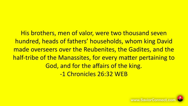 His brothers, men of valor, were two thousand seven hundred, heads of fathers’ households, whom king David made overseers over the Reubenites, the Gadites, and the half-tribe of the Manassites, for every matter pertaining to God, and for the affairs of the king. -1 Chronicles 26:32 WEB