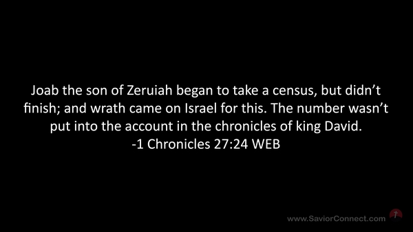 Joab the son of Zeruiah began to take a census, but didn’t finish; and wrath came on Israel for this. The number wasn’t put into the account in the chronicles of king David. -1 Chronicles 27:24 WEB