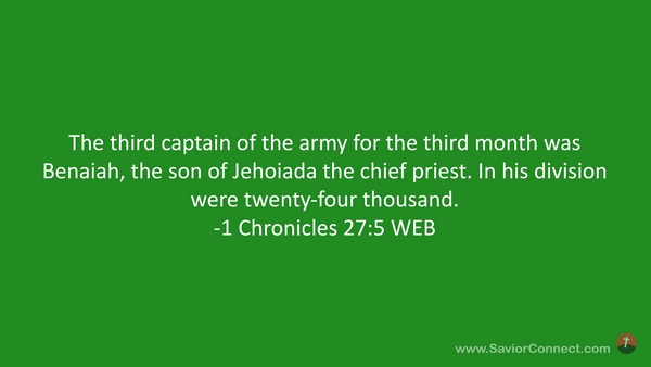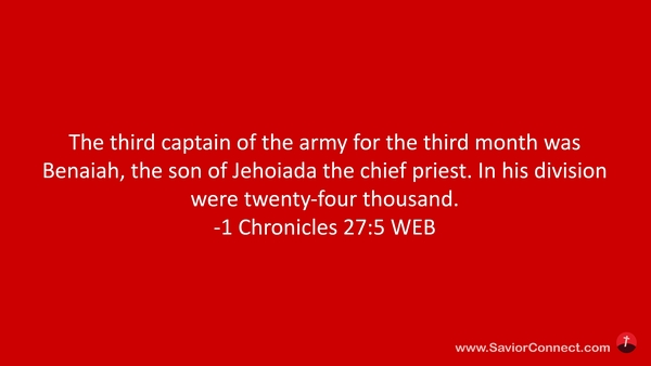 The third captain of the army for the third month was Benaiah, the son of Jehoiada the chief priest. In his division were twenty-four thousand. -1 Chronicles 27:5 WEB