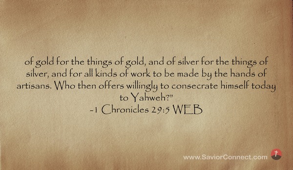 of gold for the things of gold, and of silver for the things of silver, and for all kinds of work to be made by the hands of artisans. Who then offers willingly to consecrate himself today to Yahweh?” -1 Chronicles 29:5 WEB