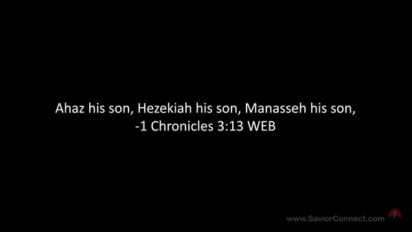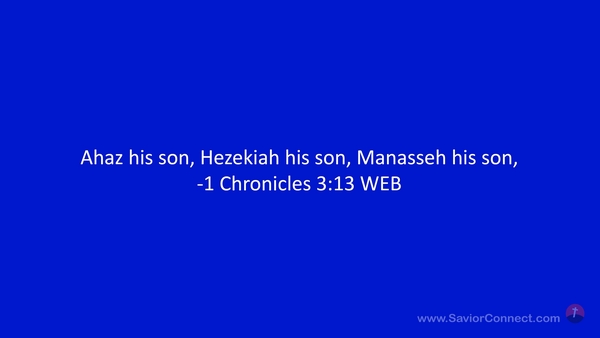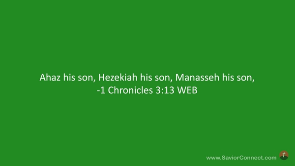 Ahaz his son, Hezekiah his son, Manasseh his son, -1 Chronicles 3:13 WEB