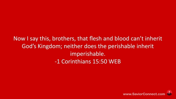 Now I say this, brothers, that flesh and blood can’t inherit God’s Kingdom; neither does the perishable inherit imperishable. -1 Corinthians 15:50 WEB