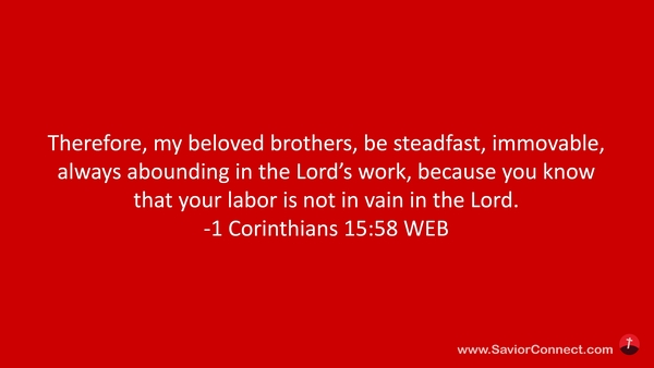 Therefore, my beloved brothers, be steadfast, immovable, always abounding in the Lord’s work, because you know that your labor is not in vain in the Lord. -1 Corinthians 15:58 WEB