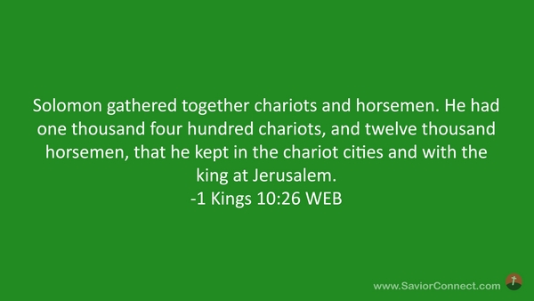 Solomon gathered together chariots and horsemen. He had one thousand four hundred chariots, and twelve thousand horsemen, that he kept in the chariot cities and with the king at Jerusalem. -1 Kings 10:26 WEB