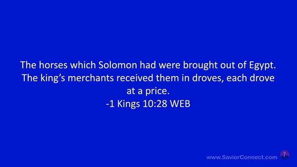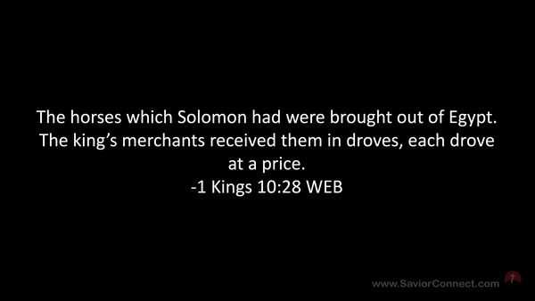 The horses which Solomon had were brought out of Egypt. The king’s merchants received them in droves, each drove at a price. -1 Kings 10:28 WEB