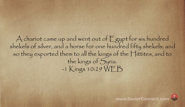 A chariot came up and went out of Egypt for six hundred shekels of silver, and a horse for one hundred fifty shekels; and so they exported them to all the kings of the Hittites, and to the kings of Syria. -1 Kings 10:29 WEB