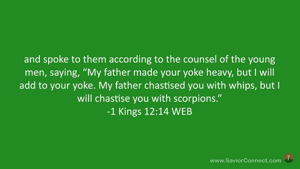 and spoke to them according to the counsel of the young men, saying, “My father made your yoke heavy, but I will add to your yoke. My father chastised you with whips, but I will chastise you with scorpions.” -1 Kings 12:14 WEB