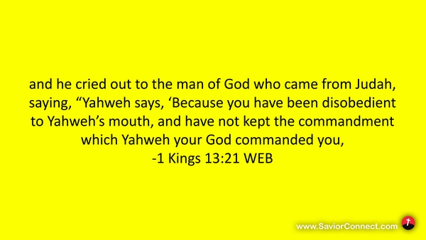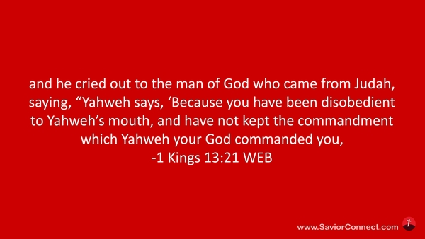 and he cried out to the man of God who came from Judah, saying, “Yahweh says, 'Because you have been disobedient to Yahweh’s mouth, and have not kept the commandment which Yahweh your God commanded you, -1 Kings 13:21 WEB