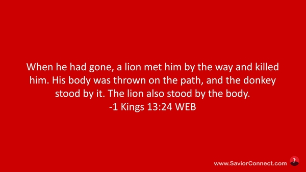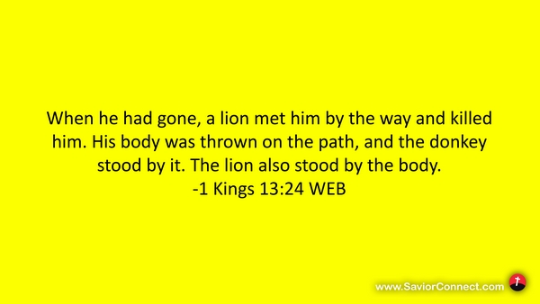 When he had gone, a lion met him by the way and killed him. His body was thrown on the path, and the donkey stood by it. The lion also stood by the body. -1 Kings 13:24 WEB