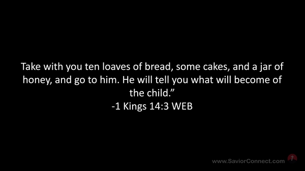 Take with you ten loaves of bread, some cakes, and a jar of honey, and go to him. He will tell you what will become of the child.” -1 Kings 14:3 WEB