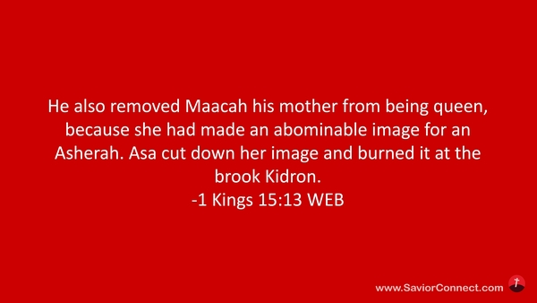 He also removed Maacah his mother from being queen, because she had made an abominable image for an Asherah. Asa cut down her image and burned it at the brook Kidron. -1 Kings 15:13 WEB