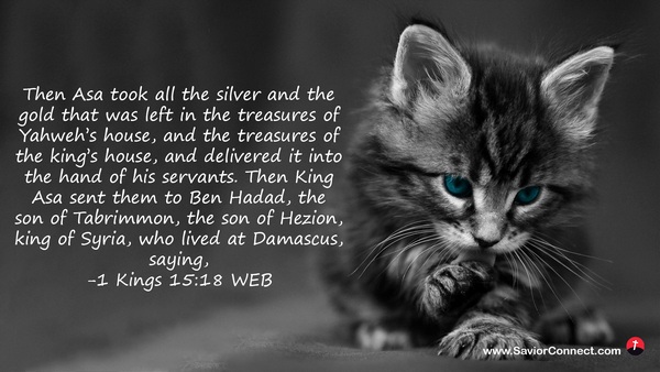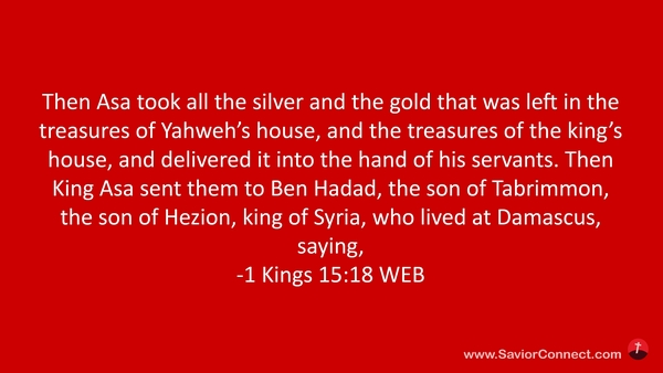 Then Asa took all the silver and the gold that was left in the treasures of Yahweh’s house, and the treasures of the king’s house, and delivered it into the hand of his servants. Then King Asa sent them to Ben Hadad, the son of Tabrimmon, the son of Hezion, king of Syria, who lived at Damascus, saying, -1 Kings 15:18 WEB