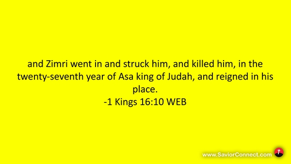 and Zimri went in and struck him, and killed him, in the twenty-seventh year of Asa king of Judah, and reigned in his place. -1 Kings 16:10 WEB