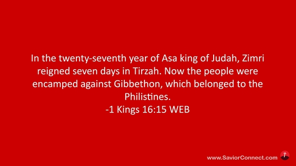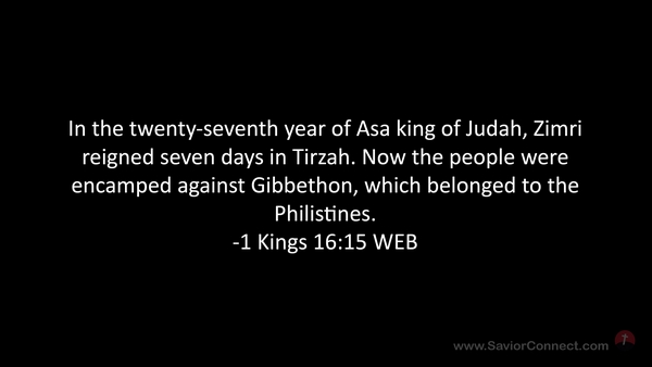 In the twenty-seventh year of Asa king of Judah, Zimri reigned seven days in Tirzah. Now the people were encamped against Gibbethon, which belonged to the Philistines. -1 Kings 16:15 WEB