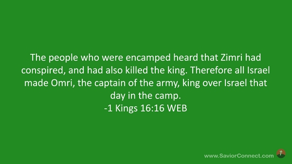 The people who were encamped heard that Zimri had conspired, and had also killed the king. Therefore all Israel made Omri, the captain of the army, king over Israel that day in the camp. -1 Kings 16:16 WEB