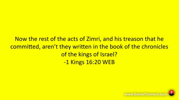 Now the rest of the acts of Zimri, and his treason that he committed, aren’t they written in the book of the chronicles of the kings of Israel? -1 Kings 16:20 WEB