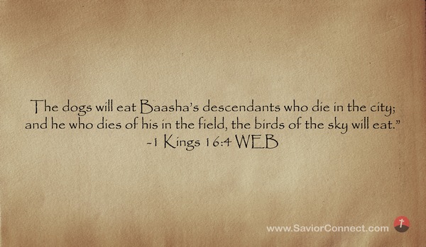The dogs will eat Baasha’s descendants who die in the city; and he who dies of his in the field, the birds of the sky will eat.” -1 Kings 16:4 WEB