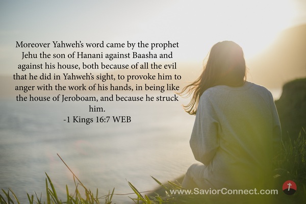 Moreover Yahweh’s word came by the prophet Jehu the son of Hanani against Baasha and against his house, both because of all the evil that he did in Yahweh’s sight, to provoke him to anger with the work of his hands, in being like the house of Jeroboam, and because he struck him. -1 Kings 16:7 WEB