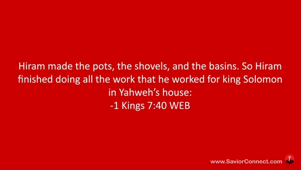 Hiram made the pots, the shovels, and the basins. So Hiram finished doing all the work that he worked for king Solomon in Yahweh’s house: -1 Kings 7:40 WEB