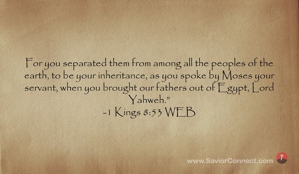 For you separated them from among all the peoples of the earth, to be your inheritance, as you spoke by Moses your servant, when you brought our fathers out of Egypt, Lord Yahweh.” -1 Kings 8:53 WEB