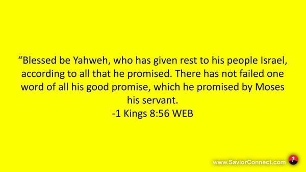 “Blessed be Yahweh, who has given rest to his people Israel, according to all that he promised. There has not failed one word of all his good promise, which he promised by Moses his servant. -1 Kings 8:56 WEB