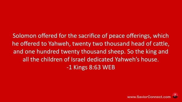 Solomon offered for the sacrifice of peace offerings, which he offered to Yahweh, twenty two thousand head of cattle, and one hundred twenty thousand sheep. So the king and all the children of Israel dedicated Yahweh’s house. -1 Kings 8:63 WEB