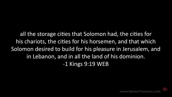 all the storage cities that Solomon had, the cities for his chariots, the cities for his horsemen, and that which Solomon desired to build for his pleasure in Jerusalem, and in Lebanon, and in all the land of his dominion. -1 Kings 9:19 WEB