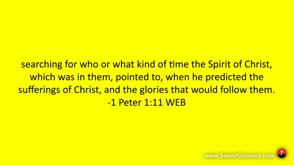 searching for who or what kind of time the Spirit of Christ, which was in them, pointed to, when he predicted the sufferings of Christ, and the glories that would follow them. -1 Peter 1:11 WEB