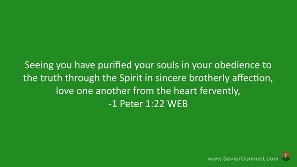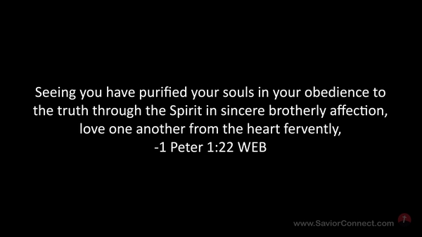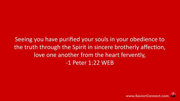 Seeing you have purified your souls in your obedience to the truth through the Spirit in sincere brotherly affection, love one another from the heart fervently, -1 Peter 1:22 WEB