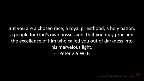 But you are a chosen race, a royal priesthood, a holy nation, a people for God’s own possession, that you may proclaim the excellence of him who called you out of darkness into his marvelous light. -1 Peter 2:9 WEB