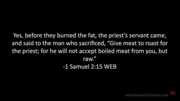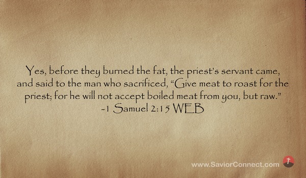 Yes, before they burned the fat, the priest’s servant came, and said to the man who sacrificed, “Give meat to roast for the priest; for he will not accept boiled meat from you, but raw.” -1 Samuel 2:15 WEB