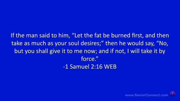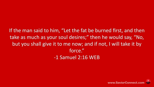 If the man said to him, “Let the fat be burned first, and then take as much as your soul desires;” then he would say, “No, but you shall give it to me now; and if not, I will take it by force.” -1 Samuel 2:16 WEB