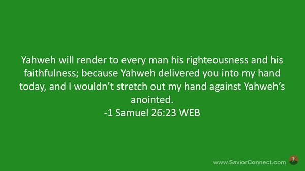 Yahweh will render to every man his righteousness and his faithfulness; because Yahweh delivered you into my hand today, and I wouldn’t stretch out my hand against Yahweh’s anointed. -1 Samuel 26:23 WEB