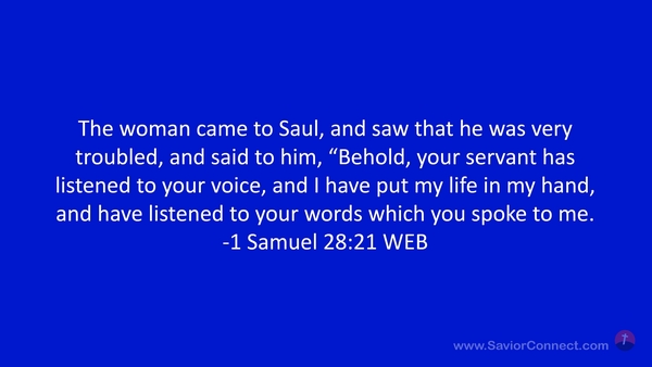 The woman came to Saul, and saw that he was very troubled, and said to him, “Behold, your servant has listened to your voice, and I have put my life in my hand, and have listened to your words which you spoke to me. -1 Samuel 28:21 WEB