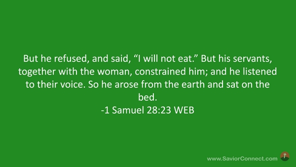 But he refused, and said, “I will not eat.” But his servants, together with the woman, constrained him; and he listened to their voice. So he arose from the earth and sat on the bed. -1 Samuel 28:23 WEB