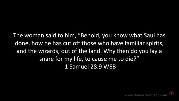 The woman said to him, “Behold, you know what Saul has done, how he has cut off those who have familiar spirits, and the wizards, out of the land. Why then do you lay a snare for my life, to cause me to die?” -1 Samuel 28:9 WEB