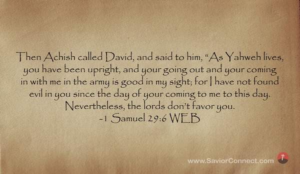 Then Achish called David, and said to him, “As Yahweh lives, you have been upright, and your going out and your coming in with me in the army is good in my sight; for I have not found evil in you since the day of your coming to me to this day. Nevertheless, the lords don’t favor you. -1 Samuel 29:6 WEB