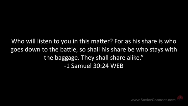 Who will listen to you in this matter? For as his share is who goes down to the battle, so shall his share be who stays with the baggage. They shall share alike.” -1 Samuel 30:24 WEB